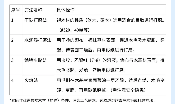 木毛一旦接觸或吸收水分或溶劑,就受濕潤(rùn)膨脹而豎起來,使顏色無法均勻著色與木紋內(nèi)部,而堆積在它周圍,出現(xiàn)木紋(導(dǎo)管)內(nèi)部未著上顏色的不良,打磨后就出現(xiàn)了小白點(diǎn)(芝麻點(diǎn))。所以,涂飾前一定要充分打磨去除木毛(薄片材料時(shí),要避免砂穿),為涂裝和著色提供一個(gè)優(yōu)質(zhì)的基底條件。