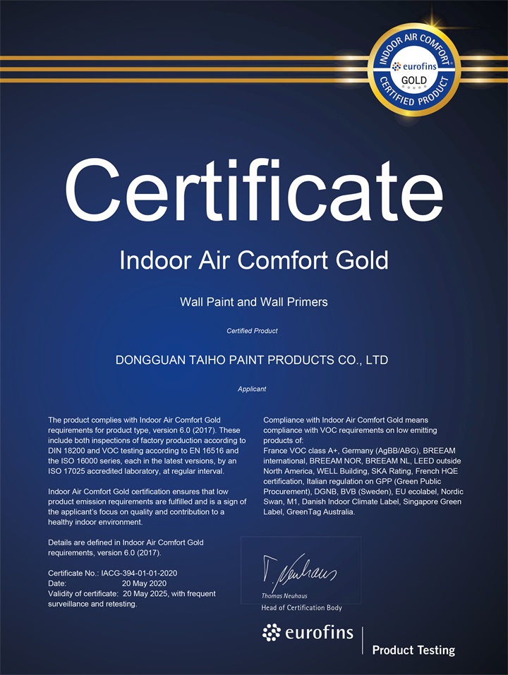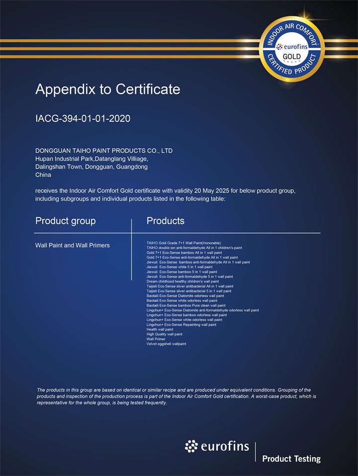 近日,大寶漆22款綠色墻面漆產(chǎn)品通過了歐洲室內(nèi)最嚴格VOC排放標準的IAC-Gold(Indoor Air Comfort-Gold室內(nèi)空氣質(zhì)量-金級)認證,這表示大寶漆產(chǎn)品在環(huán)保性能方面再次贏得了重要國際權(quán)威認可。此次通過IAC-Gold認證,對大寶漆來說是一種極高的品牌榮譽,表明大寶漆產(chǎn)品性能優(yōu)越,各項指標達到業(yè)界公認的嚴苛的國際標準。