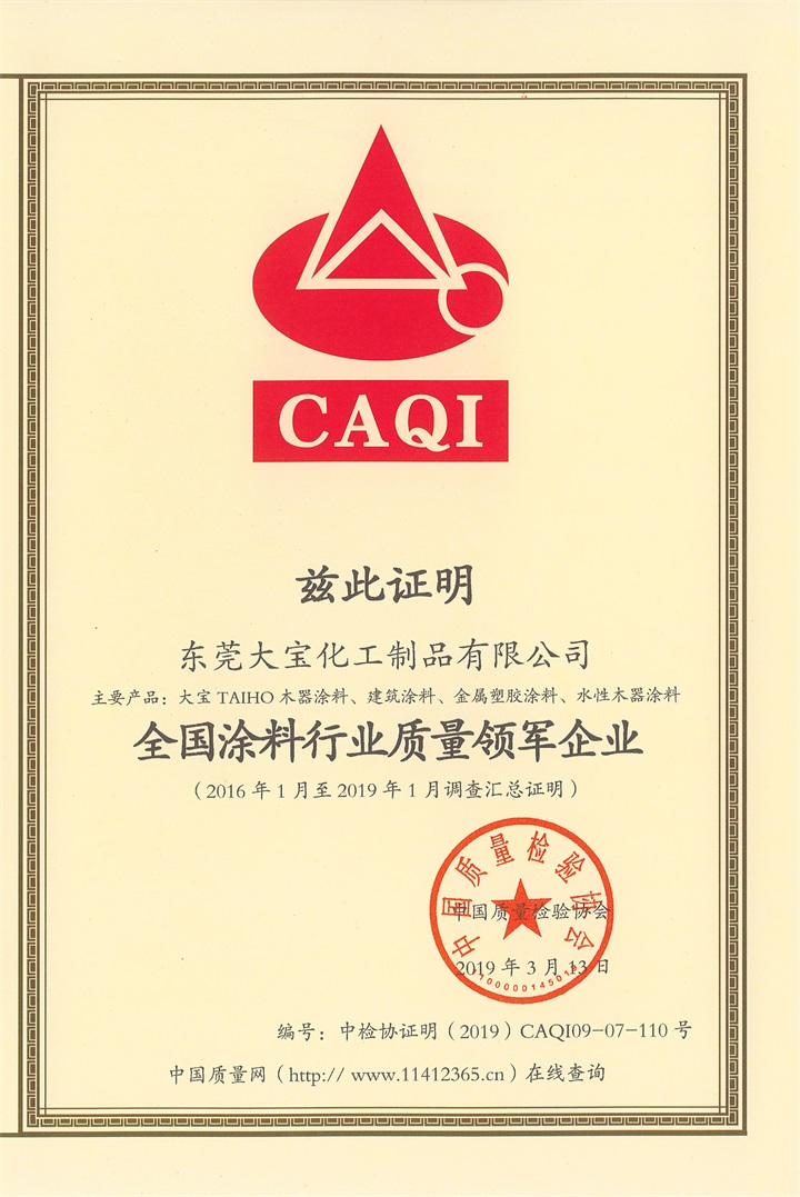 中國(guó)質(zhì)檢協(xié)會(huì)通過頒發(fā)“全國(guó)涂料行業(yè)質(zhì)量領(lǐng)軍企業(yè)”和“全國(guó)質(zhì)量檢驗(yàn)穩(wěn)定合格產(chǎn)品”證書,旨在表彰安全生產(chǎn)、質(zhì)量管理體系健全、售后服務(wù)制度完善、有社會(huì)責(zé)任感、講誠(chéng)信重質(zhì)量并在行業(yè)具有廣泛代表性的優(yōu)秀企業(yè)。作為國(guó)家高新技術(shù)企業(yè),大寶漆不論是在產(chǎn)品質(zhì)量上,還是在品牌服務(wù)、涂裝體驗(yàn)都走在了行業(yè)的前列。