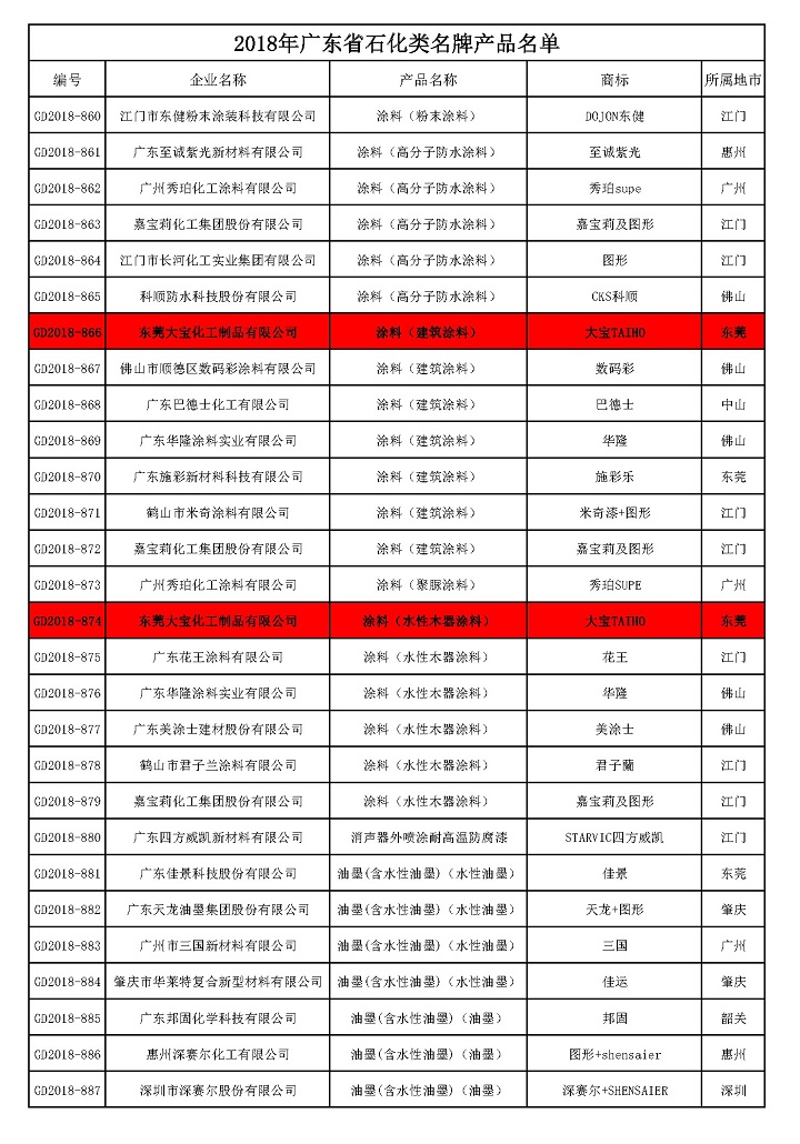 根據(jù)《廣東省名牌產(chǎn)品評(píng)價(jià)指南》標(biāo)準(zhǔn)要求,在企業(yè)自愿申報(bào)的基礎(chǔ)上,經(jīng)申報(bào)資料初審、申報(bào)數(shù)據(jù)公示、企業(yè)現(xiàn)場(chǎng)審查、專家綜合評(píng)價(jià)、廣東質(zhì)量品牌評(píng)審專家委員會(huì)審議確認(rèn),授予大寶化工生產(chǎn)的“大寶漆”牌涂料(詳見(jiàn)附件)為2018年度廣東省“石化類名牌產(chǎn)品”。