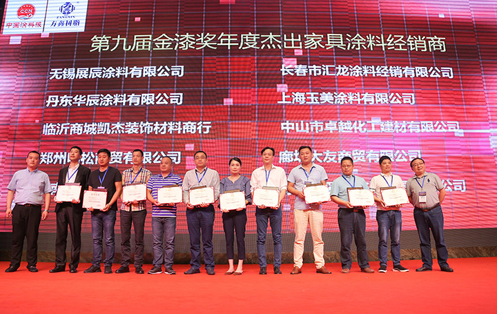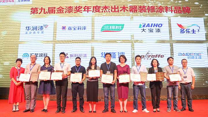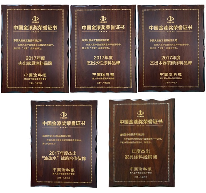 作為民族涂料品牌,大寶漆在金漆獎頒獎典禮斬獲2017年度“杰出木器裝修涂料品牌”、“杰出家具涂料品牌”、“杰出水性涂料品牌”、“杰出油改水戰(zhàn)略合作合伴”等四項殊榮。同時,大寶漆山東經(jīng)銷商濟南漆中寶貿(mào)易有限公司獲得2017年度杰出家具涂料經(jīng)銷商獎項。