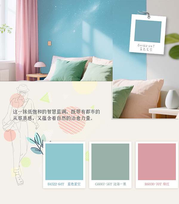 在春夏交替的時(shí)節(jié),色彩是最快改變空間氛圍的利器。2025年度大寶推薦色B4322-64T藍(lán)色星空,靈感來源于捕捉了破曉時(shí)分的澄澈與日暮時(shí)分的溫柔。淺藍(lán)的輕盈中糅入一絲綠意,如同晨光微熹時(shí)的天幕,又似暮色四合前的遠(yuǎn)山。