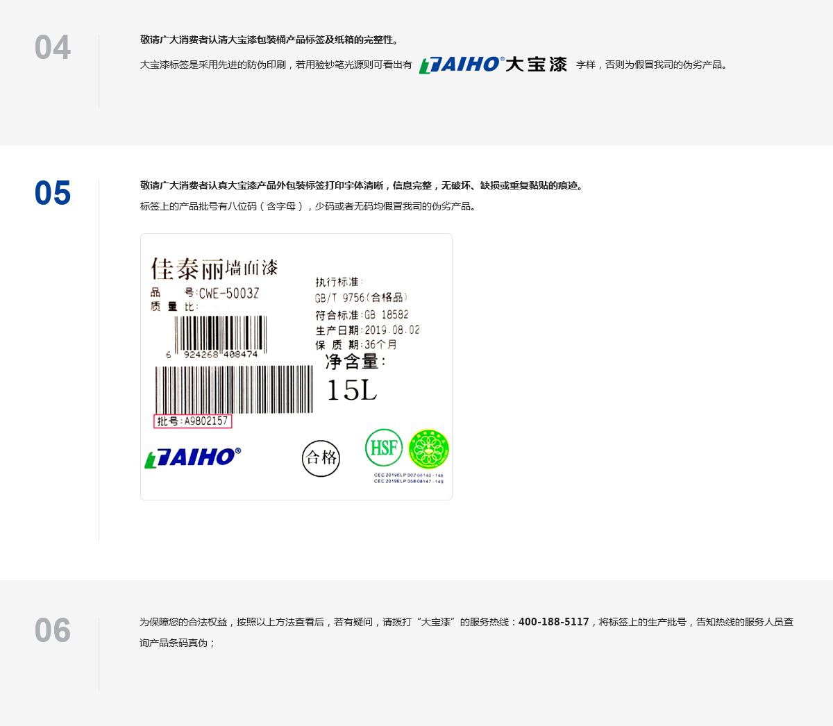 為保障您的合法權益,按照以上方法查看后,若有疑問,請撥打“大寶漆”的服務熱線:400-188-5117,將標簽上的生產批號,告知熱線的服務人員查詢產品條碼真偽;